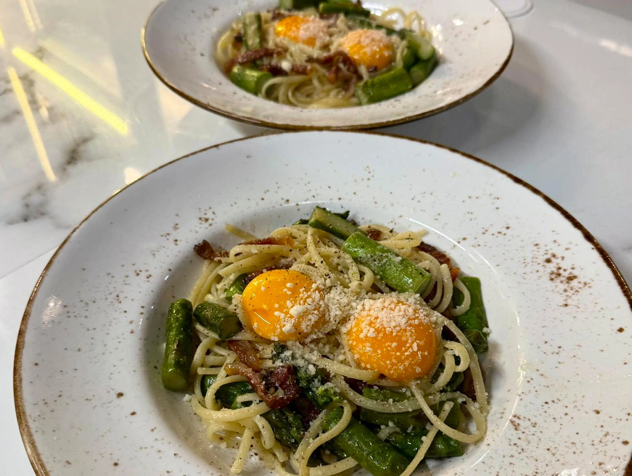 Skoro makaron, to oczywistą propozycją jest carbonara z zielonymi szparagami! Ponadto zjecie tam też makaron w cytrynowo-maślanym sosie z zielonymi szparagami, makaron z wołowiną i szparagami i pistacjami, kremowe risotto ze cytrynowo-parmezanowe z zielonymi szparagami, a także dwie pizze - bianca z białymi szparagami i mortadelą oraz z pomidorami i confit i zielonymi szparagami.