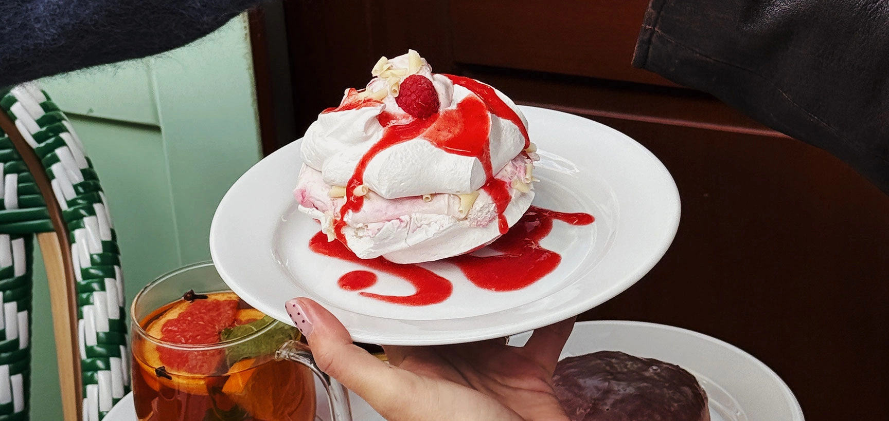 Wnętrze jest przytulne i słodkie, jak sama królowa beza, wypełnia je miękkie światło, pastelowe kolory i mnóstwo detali inspirowanych specjałem tego miejsca. Ściany zdobią rysunki francuskiego artysty oraz zdjęcia ekipy, w tle słychać nastrojową muzykę, a w powietrzu unosi się coś wyjątkowego, co trudno nazwać.