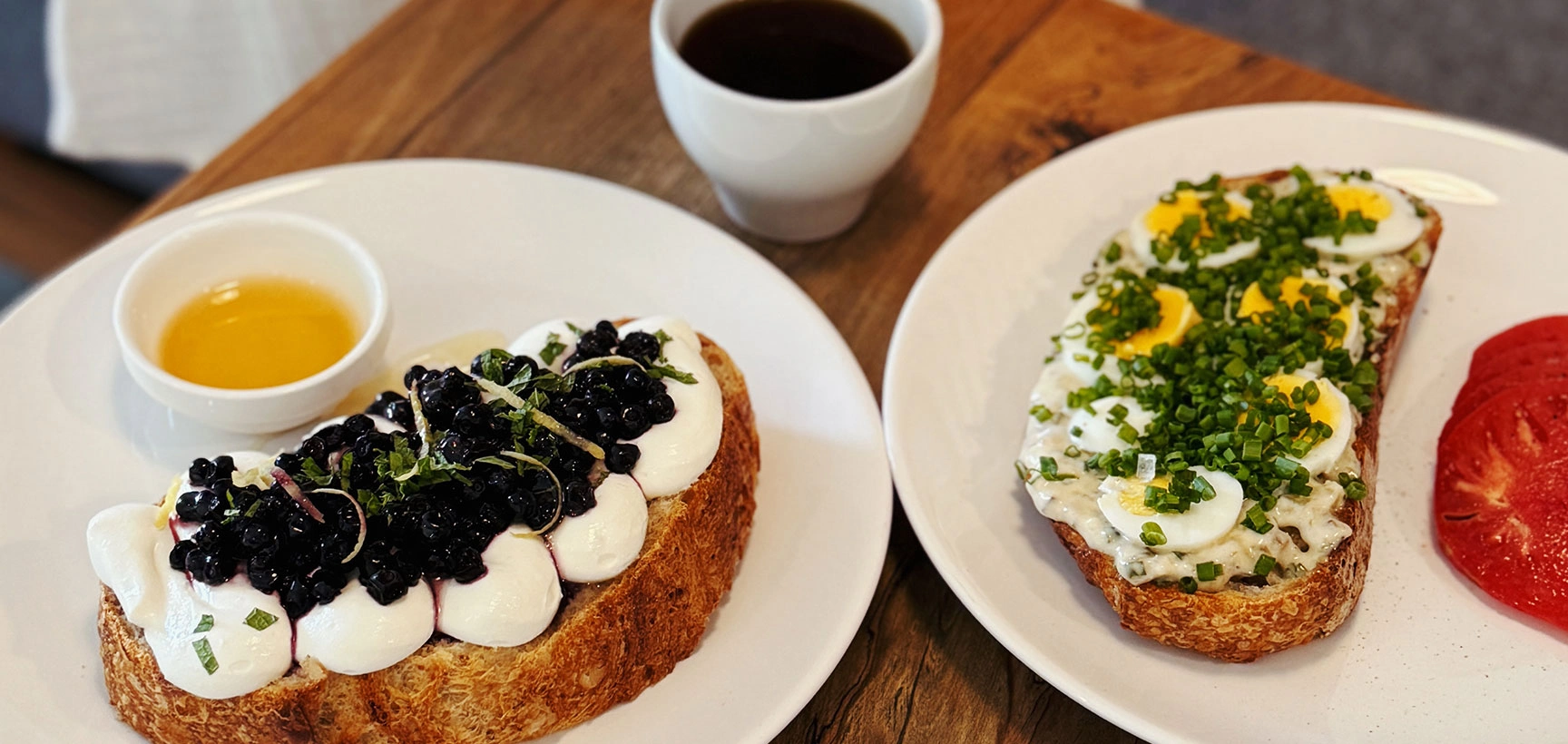 Śniadaniowe menu serwowane jest przez cały dzień – idealne dla tych, którzy lubią pospać albo po prostu dla wielbicieli chleba w każdej postaci i o każdej porze. Naszym hitem jest kromka chleba Mitte z ubijanym twarogiem ze Strzałkowa. Dodatki zmieniają się sezonowo – latem królują jagody, a w okresie jesienno-zimowym to absolutny sztos: karmelizowane śliwki z rozmarynem, orzechami laskowymi i miodem.