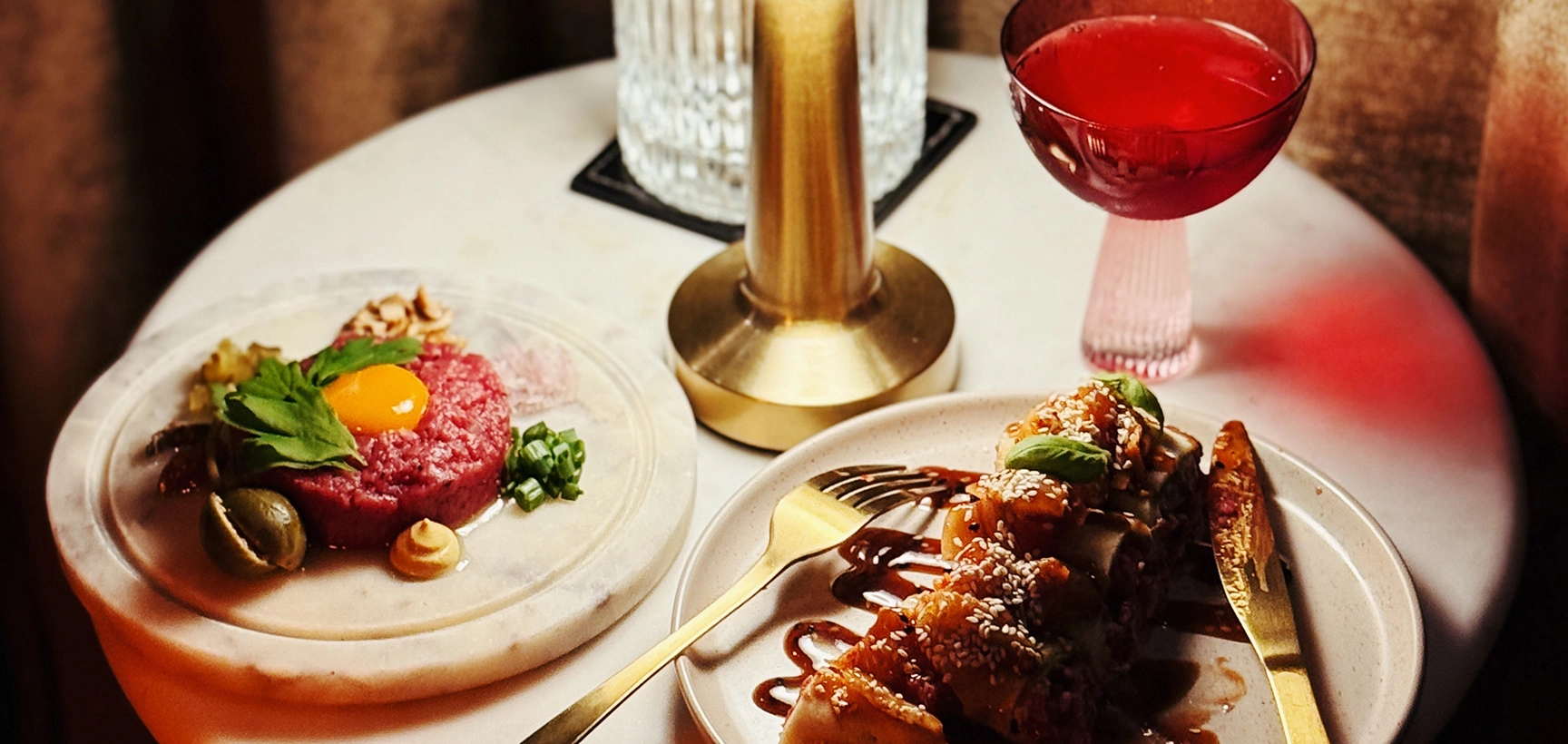 W karcie królują dania „na przegryzkę” – idealne do koktajli i rozmów. Głównym bohaterem jest oczywiście tatar, i to w kilku zupełnie różnych odsłonach. Zjecie tu tatara według Ćwierczakiewiczowej, aromatyzowanego pod kopułą dębowym dymem, klasycznego na sznytce chleba, azjatyckiego w soft sajgonkach z kimchi, grzybowo-truflowego z chrupiącym topinamburem, a nawet takiego z frytkami. Dla fanów kuchni roślinnej i dzielenia się jedzeniem przygotowano również zestaw talerzyków – lekkich, ciekawych i idealnych do wspólnego stołu.