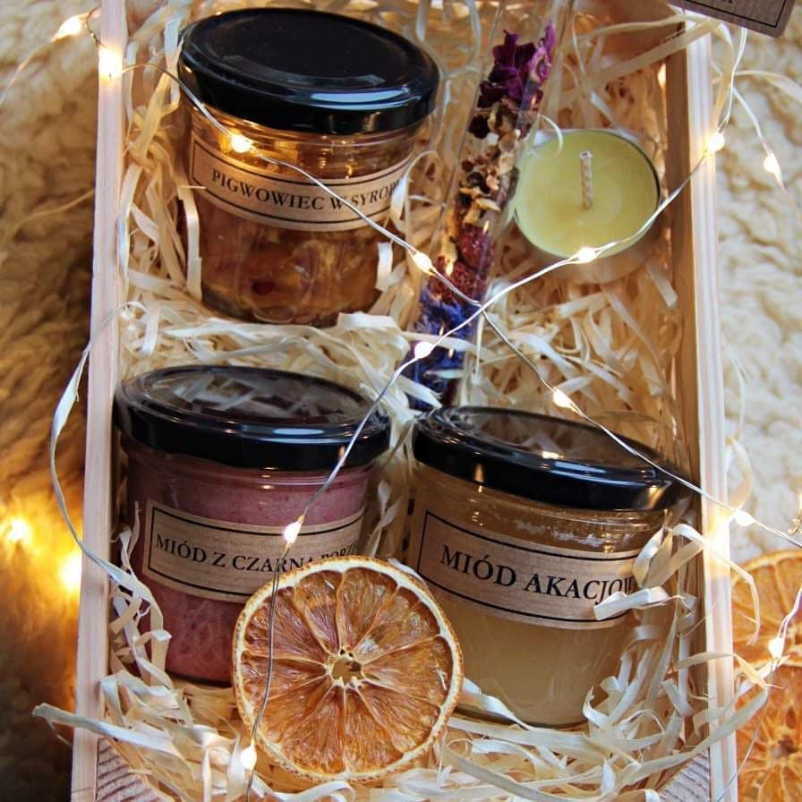 6. PASIEKA POD LASEM, czyli rodzinna firma dbająca o zdrowie i rozwój pszczółek, przygotowała wyjątkowe zestawy świąteczne ze swoimi wyrobami. W drewnianej skrzyneczce znajdziecie miodek akacjowy, z czarną porzeczką, pigwowiec z syropie, mieszankę ziół do przyrządzenia pysznego naparu i tealight z wosku pszczelego.