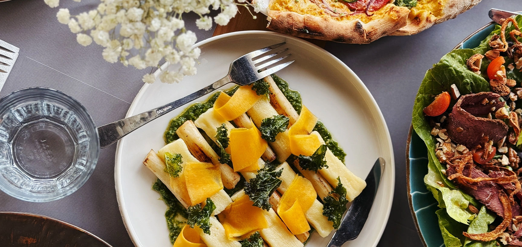 Co dokładnie skrywa menu? Specjalne, sezonowe dania (na wiosnę oczywiście ze szparagami), klasyczną pizzę z pieca opalanego drewnem czy też konkrety kuchni polskiej w naprawdę oryginalnym wydaniu [koniecznie spróbujcie pyry z gzikiem - wielkopolski klasyk, podawany tutaj w jakiejś kosmicznej formie]. Wśród przystawek znajdziemy chociażby śledzia z przetworami, deskę wędlin wędzonych przez restaurację czy deskę lokalnych rzemieślniczych serów.